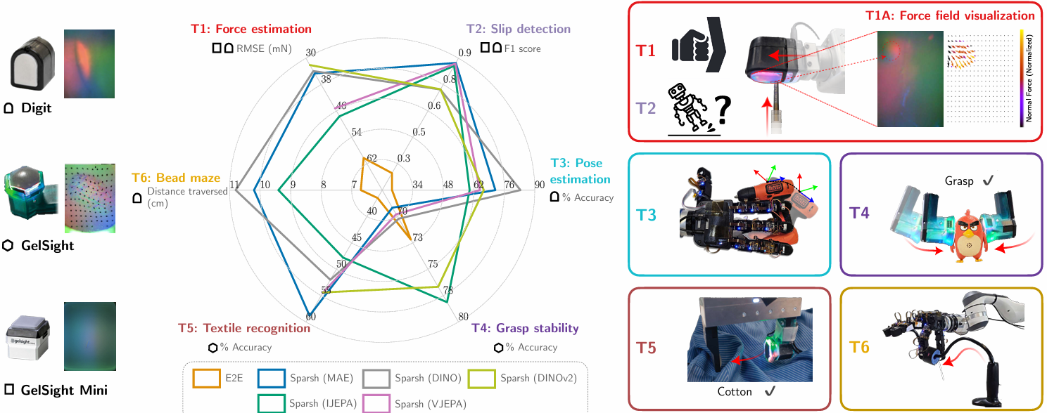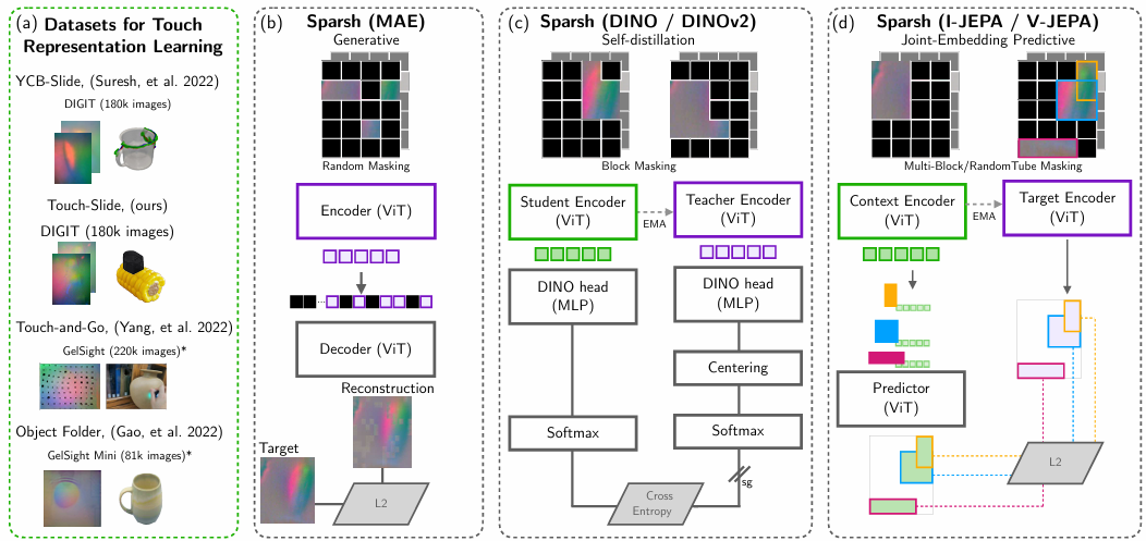 Sparsh: MAE, DINO, JEPA λ± βμμ¨ μ§λ νμ΅(SSL)βμ΄ ν΅μ¬ κΈ°μ .